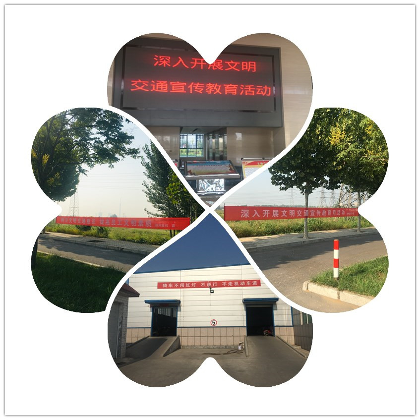 懸掛文明交通宣傳標(biāo)語,營造濃厚的宣傳氛圍。公司在廠區(qū)門口對面及存車棚外等懸掛文明交通宣傳教育標(biāo)語,使員工在上下班路上抬頭就可以看到醒目的標(biāo)語,特別是在存車棚處時刻提醒員工“騎車不闖紅燈、不逆行、不走機動車道”。通過懸掛標(biāo)語,營造了濃厚的文明交通宣傳教育氛圍。