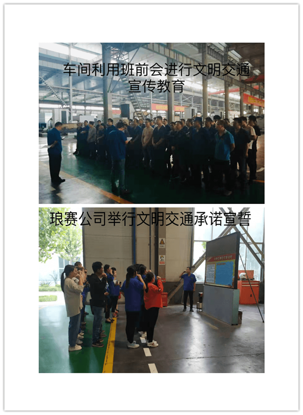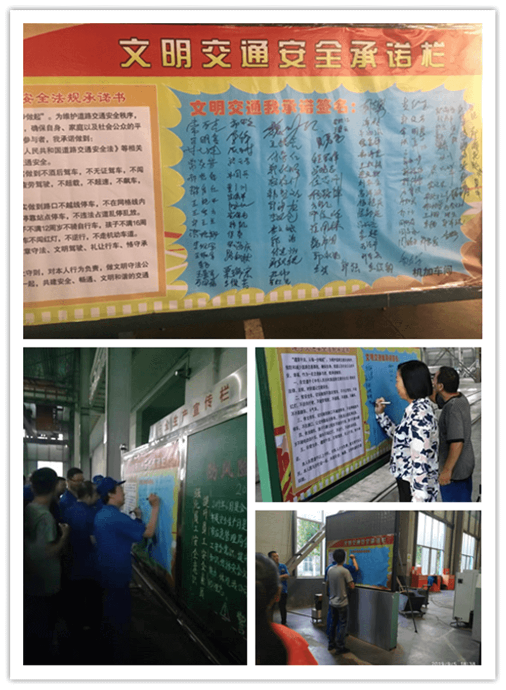 簽訂“遵守交通安全法規(guī)承諾書”。公司制作了“遵守交通安全法規(guī)承諾欄”版面十余塊,擺放在醒目位置,以部門為單位,每位員工在版面上進行簽名承諾。公司總經(jīng)理郭釧帶頭在《文明交通承諾欄》上簽名,其他領(lǐng)導(dǎo)和部門員工也陸續(xù)進行了簽名,通過交通安全承諾簽名,使每位員工時刻提醒自己,履行自己承諾。