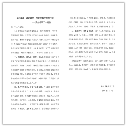 會(huì)議根據(jù)林州市委、市政府部署,及時(shí)推遲公司復(fù)工時(shí)間,并成立林州重機(jī)疫情防控工作領(lǐng)導(dǎo)小組及四個(gè)保障小組,全 面動(dòng)員和落實(shí)疫情防控工作。