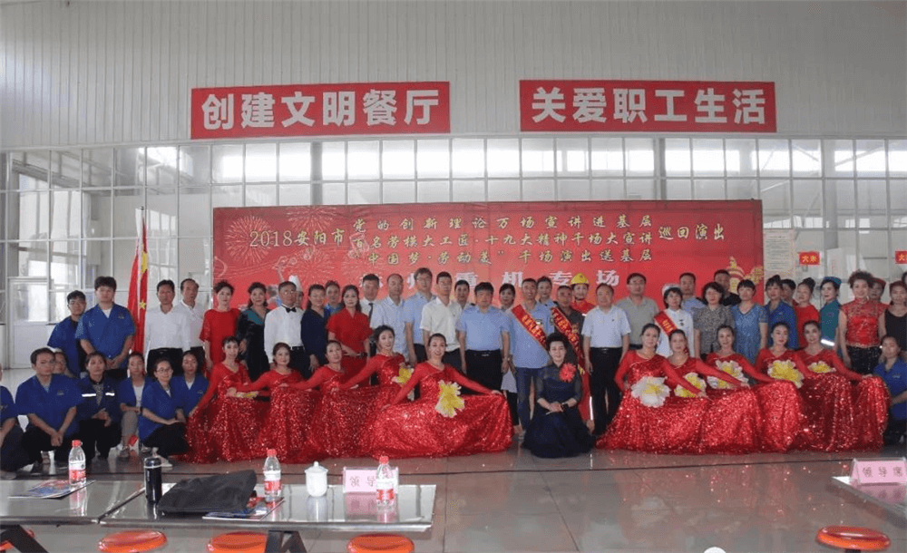 6月6日下午,安陽市黨的創(chuàng)新理論萬場宣講進(jìn)基層、百名勞模大工匠?十九大精神千場大宣講暨“中國夢 勞動美”千場演出送基層巡回演出活動走進(jìn)林州重機。河南省委宣傳部副部長尹書博,省委宣傳部理論處副處長楊小強,省委宣傳部理論教育講師團副團長趙琳,安陽市委宣傳部副部長冀曉東,安陽市委宣傳部理論科長龍晨曦,安陽市總工會宣教部部長張艾敏,林州市委常委、宣傳部長王獻(xiàn)青,林州市總工會主席栗旺生,副主席張曉云, 公司黨委副書記、副總經(jīng)理趙正斌,黨委委員、工會主席路建存及職工代表300余人等出席活動。